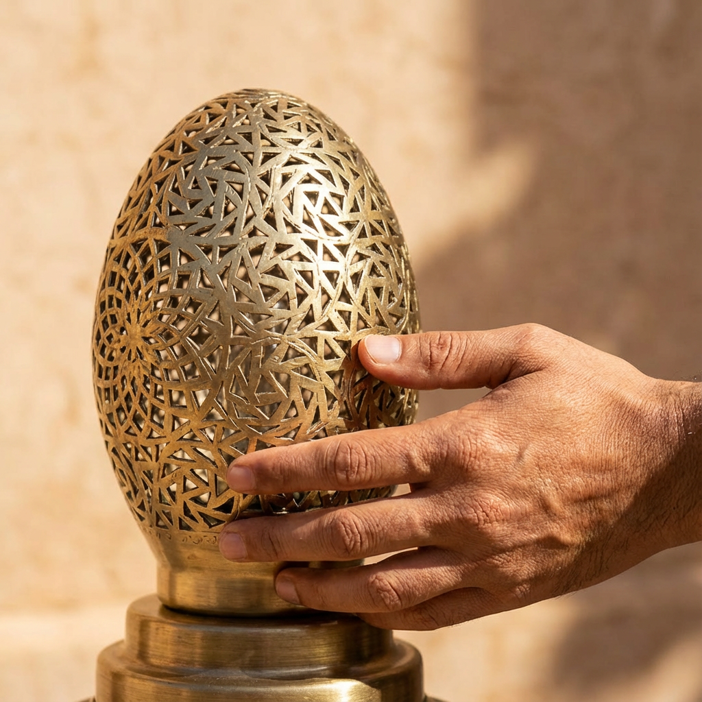 Bearing a myriad hand-punched perforations, our Moroccan floor Table lamp gives rise to a panoramic galaxy of shooting stars. Its pleasing egg-like structure stands in marked contrast to its angular solid-brass base, giving the piece an attractive sculptural quality whether lit or unlit.